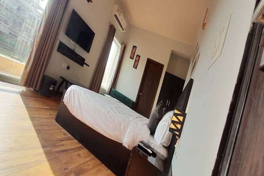 The Deluxe Room at Vrindavan Dreams Hotel and Suites is designed to offer a peaceful and comfortable stay with elegant interiors and a soothing ambiance. The room features a plush bed, ample space, and warm lighting, creating a relaxing retreat for guests. Soft furnishings and tasteful décor enhance the experience, making it ideal for both spiritual seekers and leisure travelers.